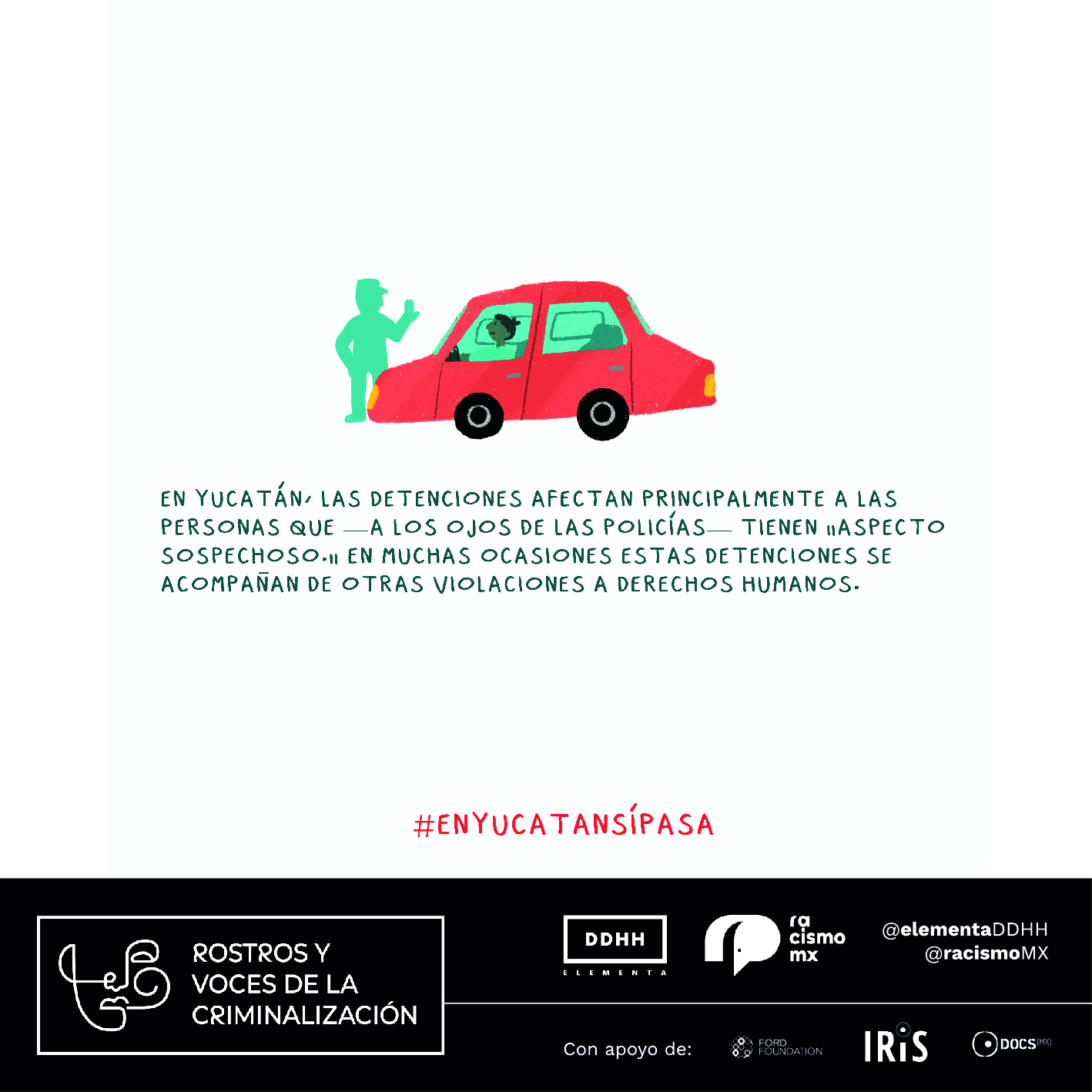 En un esfuerzo por visibilizar el problema de detenciones arbitrarias y conductas de perfilamiento racial que existe en México, desde Elementa DDHH y RacismoMX creamos el proyecto Rostros y Voces de la Criminalización. Este se trata de una iniciativa que pone al centro el rostro y la voz, por encima de las cifras y las estadísticas, de quienes han sido víctimas de este tipo de violaciones a derechos humanos, a través de materiales audiovisuales que relatan diferentes historias.